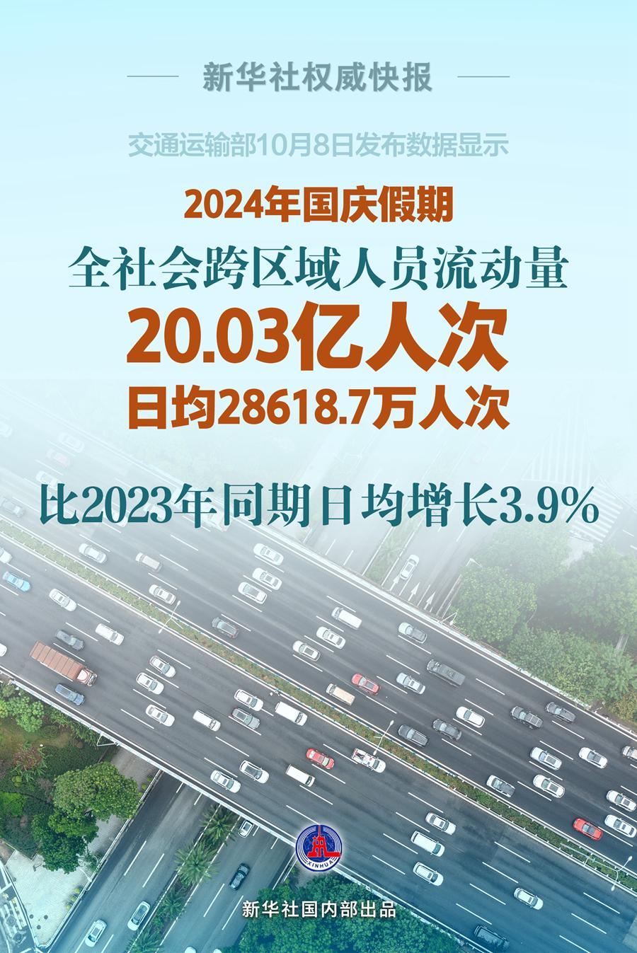 全社會跨區(qū)域人員流動量20.03億人次,日均28618.7萬人次,比2023年同期日均增長3.9%