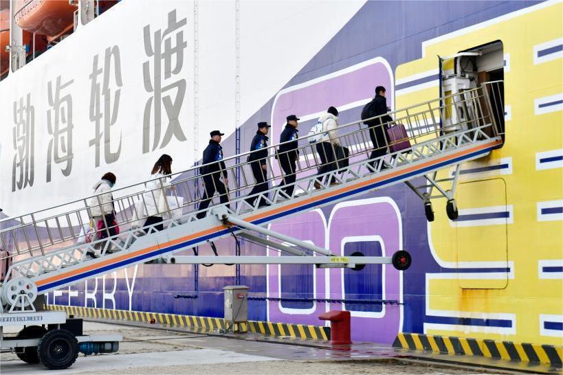 1月21日,在山東港口煙臺港客運站,煙臺市港航公安局乘務(wù)警察支隊的乘警一組三人登乘渤海輪渡“中華復(fù)興”輪執(zhí)勤。郭緒雷/攝