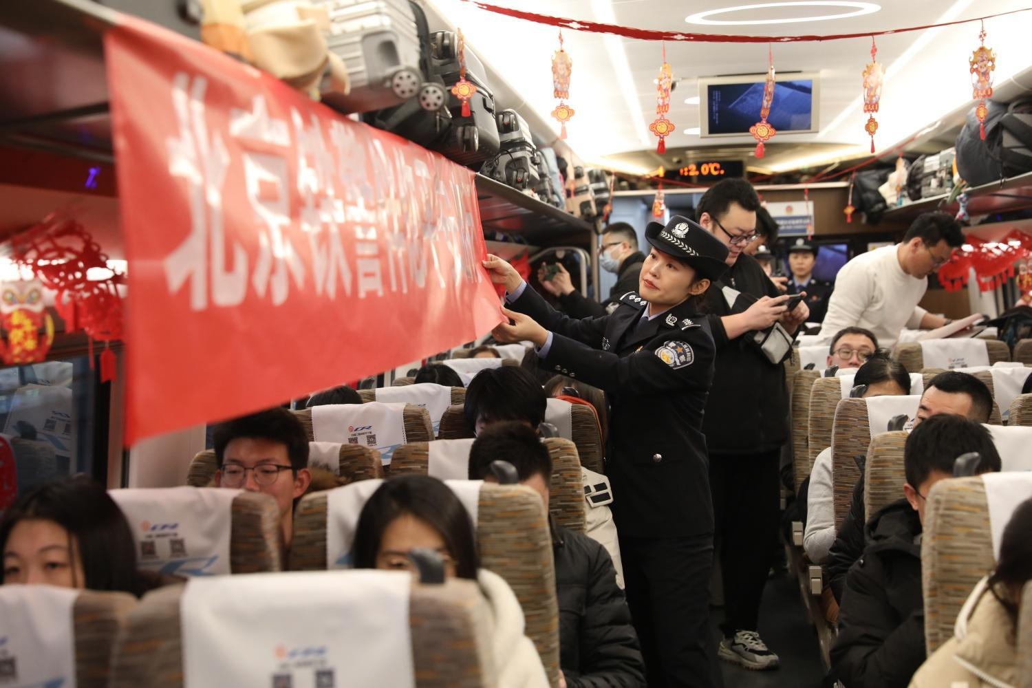 站臺(tái)上,由北京西開(kāi)往哈爾濱西的G935次列車(chē)已準(zhǔn)備就緒,車(chē)廂內(nèi)喜慶的拉花、火紅的窗花,將整個(gè)車(chē)廂裝點(diǎn)得年味十足。一條“北京鐵警伴您平安出行”的橫幅揭開(kāi)了此次列車(chē)上慶小年的主題。
