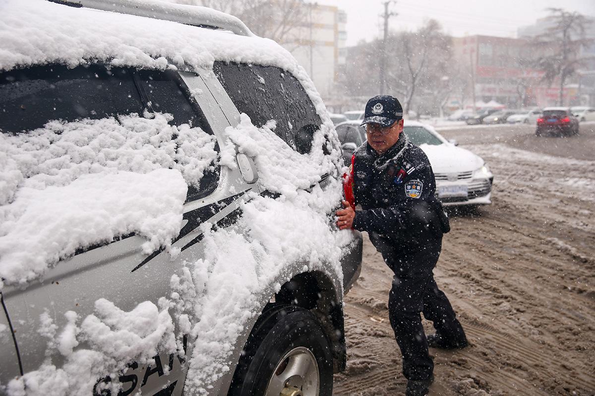 3月2日,受寒潮影響,山東省濟南市出現(xiàn)大風降溫雨雪天氣。濟南市公安局市中區(qū)分局立即啟動惡劣天氣應急預案,組織警力在重點路段、十字路口執(zhí)勤巡邏,為市民提供服務,確保群眾出行安全。