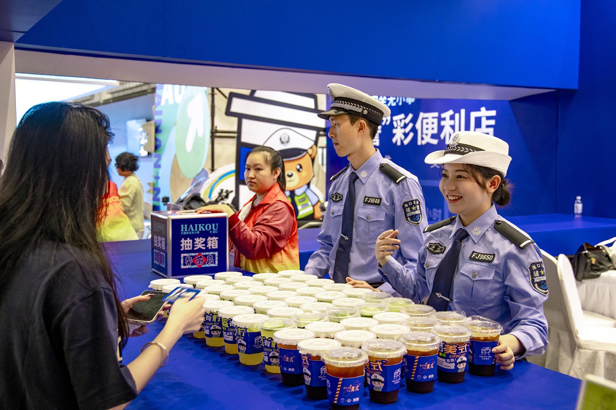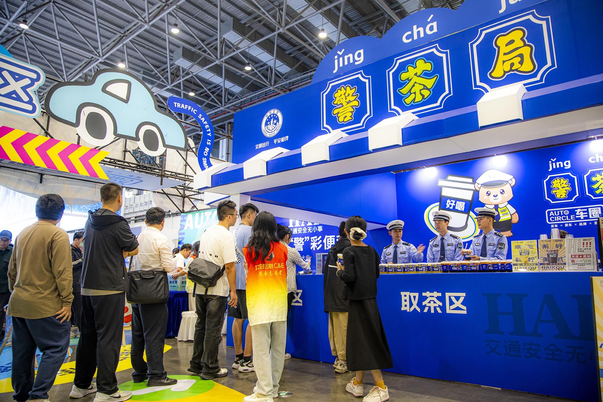 走進(jìn)1號(hào)展館,“警茶局”創(chuàng)意攤位前排起長(zhǎng)龍。市民掃描二維碼參與“交通安全快測(cè)”答題,答對(duì)6題即可兌換限量特調(diào)飲品——清新檸檬茶“幸盔有檸”杯身印有醒目戴頭盔安全提示,咖啡特調(diào)“系好美式”以安全帶印制“系好安全帶,平安出發(fā)”標(biāo)語,巧妙融合普法知識(shí)點(diǎn)。交警化身“茶飲師”為市民送上安全特調(diào)飲品,貼心叮囑出行安全事項(xiàng),警民互動(dòng)其樂融融。