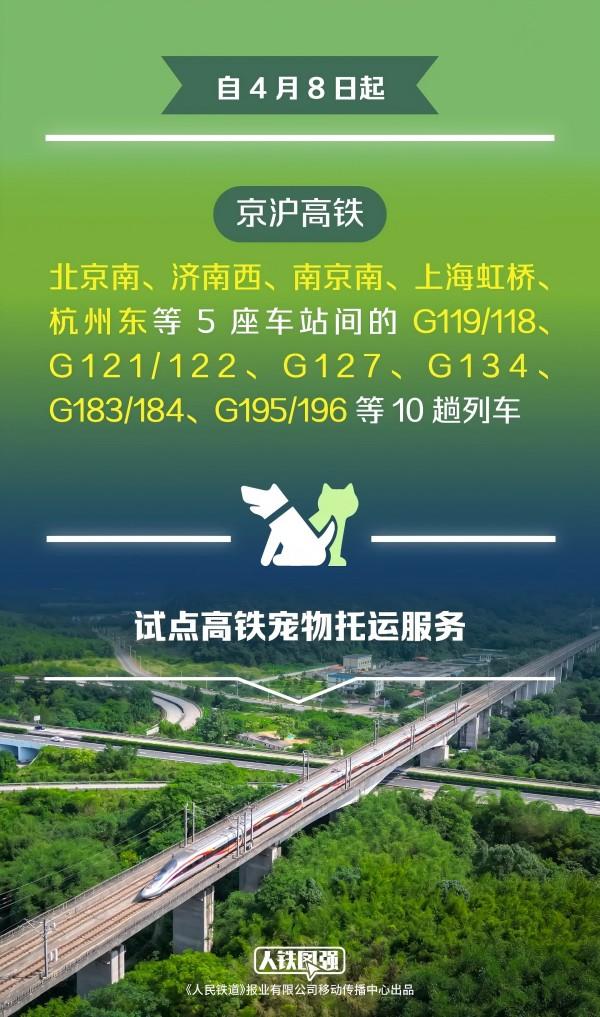 鐵路部門持續(xù)深化運輸供給側(cè)結(jié)構(gòu)性改革,積極適應(yīng)廣大旅客多樣化的出行需求,在廣泛聽取旅客意見、深入開展市場調(diào)查基礎(chǔ)上,經(jīng)過專業(yè)測試評估,自4月8日起在京滬高鐵北京南、濟南西、南京南、上海虹橋、杭州東等5座車站間的G119/118、G121/122、G127、G134、G183/184、G195/196等10趟列車上試點高鐵寵物托運服務(wù)。