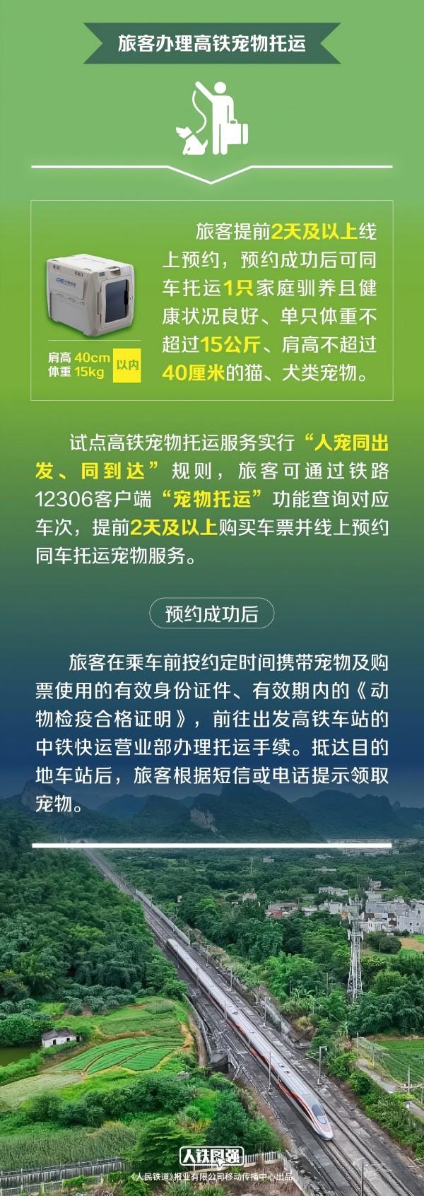 4月8日起,鐵路部門在京滬高鐵部分車次試點“隔離運輸、人寵分開、專人看護”的高鐵寵物托運服務(wù),鐵路12306同步推出“寵物托運”功能,旅客提前2天及以上線上預(yù)約,預(yù)約成功后可同車托運1只家庭馴養(yǎng)且健康狀況良好、單只體重不超過15公斤、肩高不超過40厘米的貓、犬類寵物。