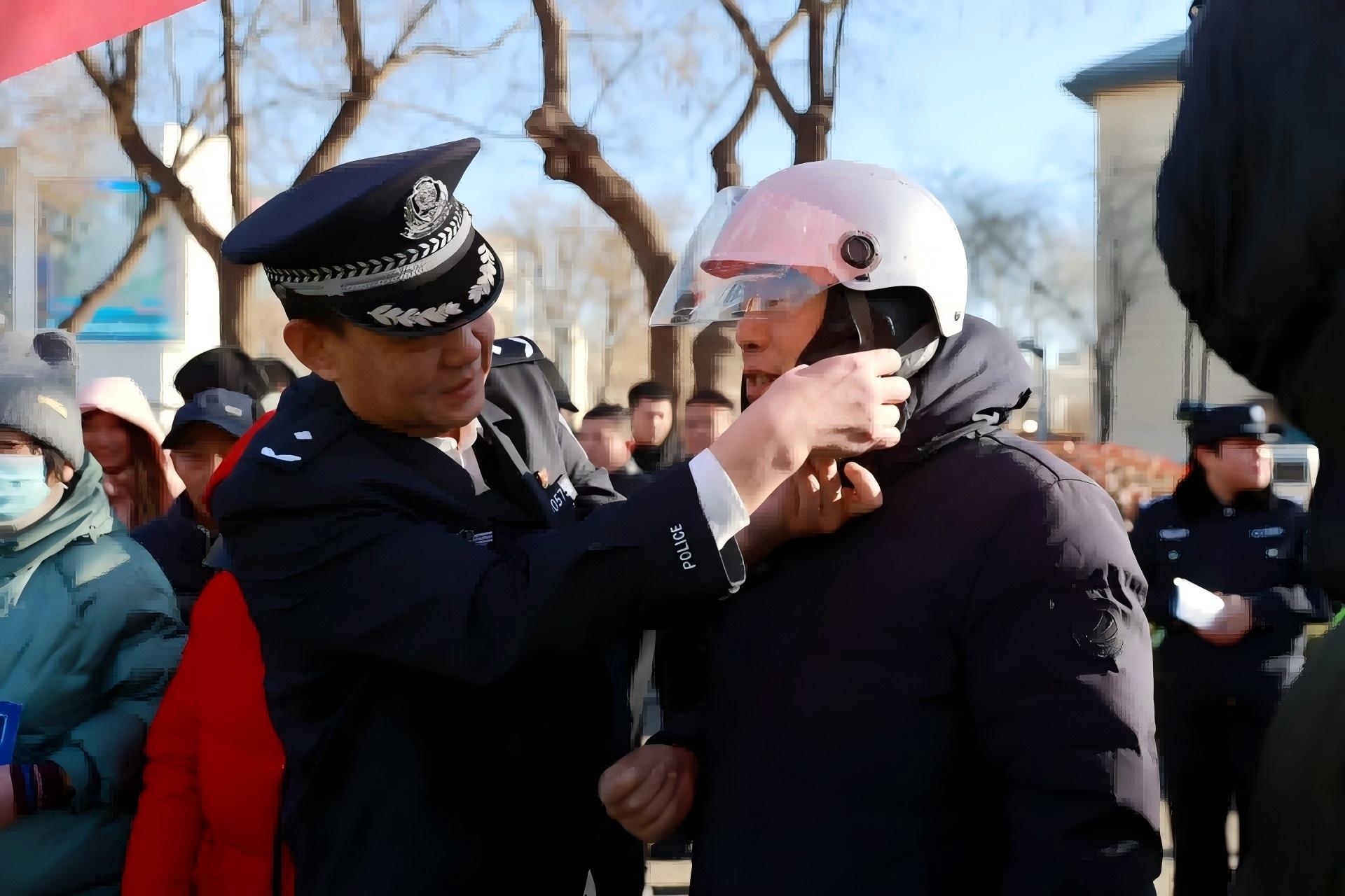 圖為長清交管大隊民警向群眾演示安全頭盔的正確佩戴方法。