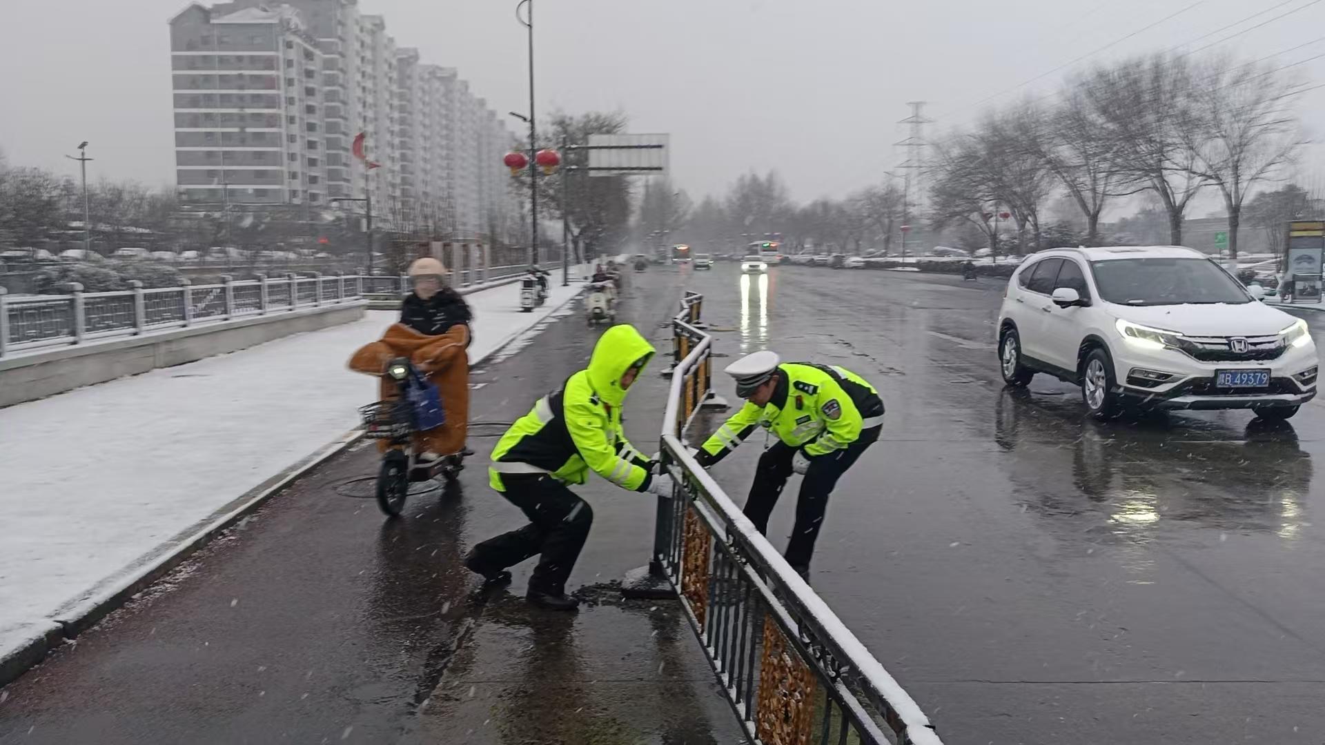 在疏導交通的同時,執(zhí)勤交警時刻關注路面狀況,及時處置各類突發(fā)險情。1月29日晚,高速各大隊為防止雪后路面、橋面結冰,聯合交通運輸等部門預防性播撒融雪劑;30日早高峰期間,勤務四大隊執(zhí)勤人員在大南門附近發(fā)現因風雪倒地的護欄,迅速合力將其扶正固定,消除了由此可能引發(fā)的交通事故隱患;勤務一大隊則加強了對轄區(qū)國省道、橋梁、涵洞等重點路段的巡邏頻次,細致排查積雪、結冰及各類安全隱患,確保不放過一處風險。