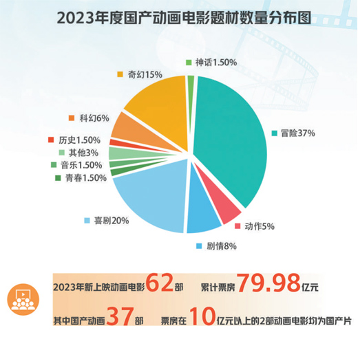 現(xiàn)實(shí)和預(yù)期,給了動畫人開拓事業(yè)的底氣。據(jù)不完全統(tǒng)計(jì),2013年,上映33部動畫電影,總票房為16.4億元,國產(chǎn)動畫占比為38%。2023年新上映動畫電影62部,累計(jì)票房79.98億元,其中,國產(chǎn)動畫37部(含港澳臺);票房在10億元以上的2部動畫電影均為國產(chǎn)片。無論作品數(shù)量還是票房表現(xiàn),國產(chǎn)動畫電影都樹立了自己的“主場優(yōu)勢”,也在觀眾中贏得信任與口碑。