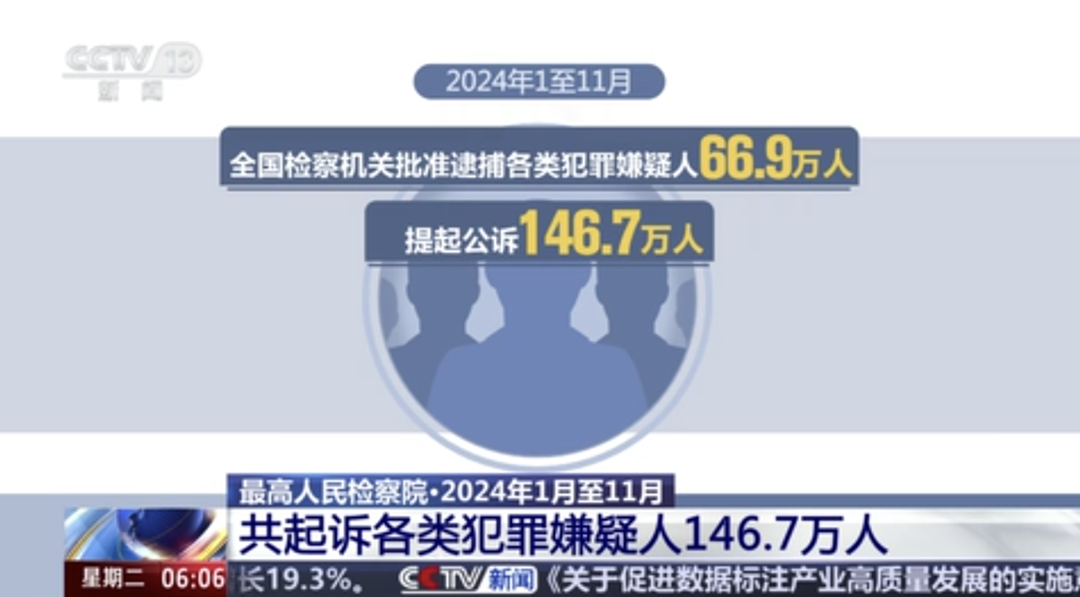 最高人民檢察院·2024年1月至11月 共起訴各類犯罪嫌疑人146.7萬(wàn)人