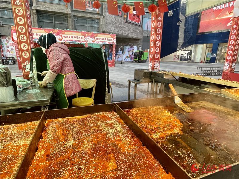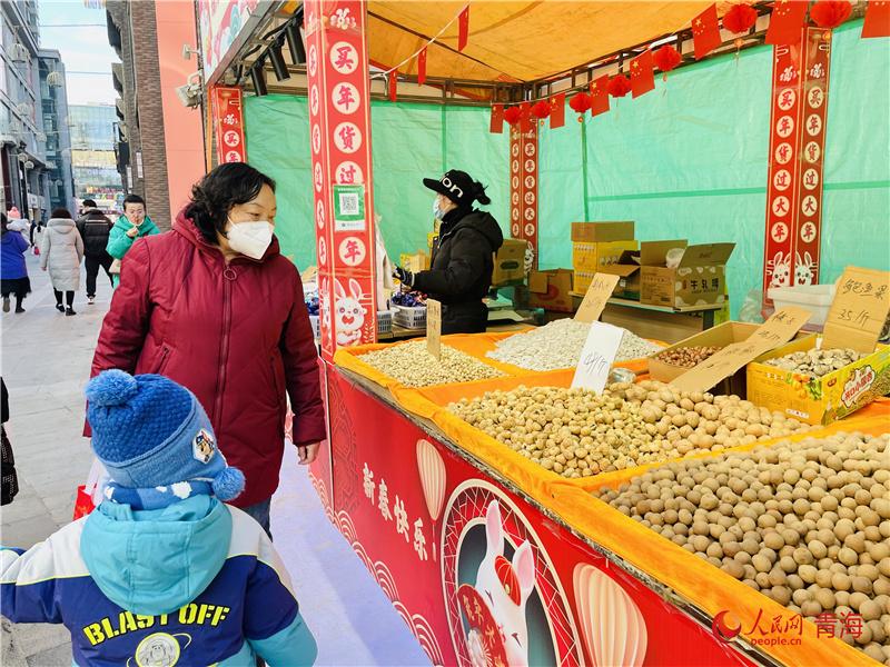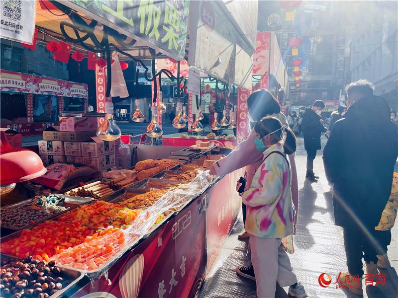 力盟商業(yè)步行街是西寧市繁華熱鬧的街區(qū)之一,瓜子糖果、春聯(lián)燈籠、海鮮肉類等年貨琳瑯滿目;糖葫蘆、臭豆腐、棉花糖等各色美食香氣撲鼻,市民聚集于此,體會濃濃年味,感受城市煙火氣。