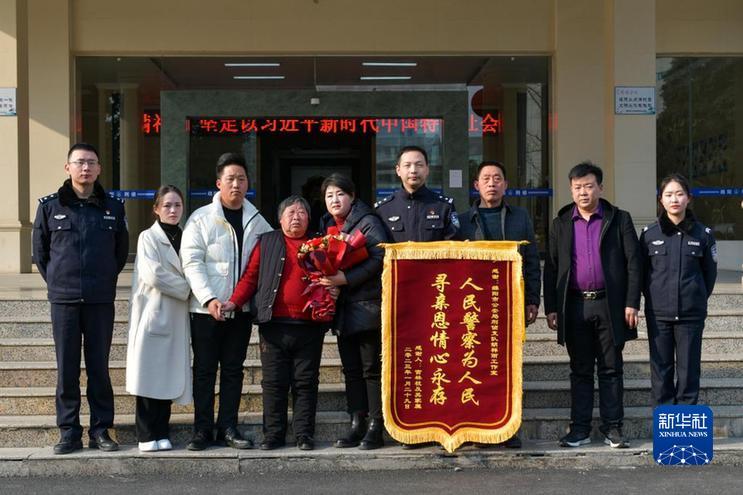 1月29日,宮女士(右五)與家人重新團圓后向公安民警贈送錦旗。(綿陽市公安局供圖)