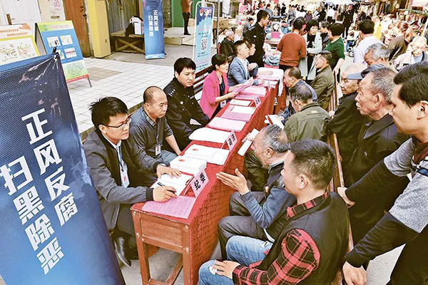 部署開展掃黑除惡專項(xiàng)斗爭(zhēng),社會(huì)治安秩序明顯改善,基層治理成效顯著。圖為在掃黑除惡斗爭(zhēng)中,福建省建甌市接訪工作人員在小橋鎮(zhèn)墟日上接待群眾來訪。新華社記者張國(guó)?。瘮z