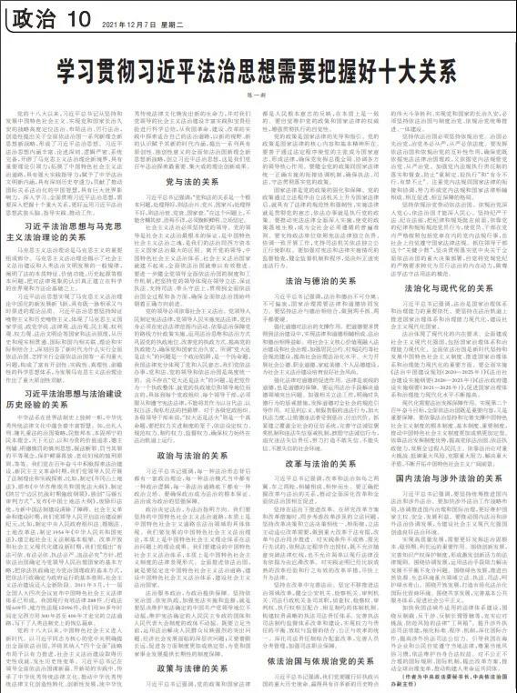12月7日,人民日?qǐng)?bào)刊發(fā)中央政法委秘書長(zhǎng)、中央依法治國(guó)辦副主任陳一新學(xué)習(xí)貫徹習(xí)近平法治思想的署名文章,從習(xí)近平法治思想與馬克思主義法治理論的關(guān)系、習(xí)近平法治思想與法治建設(shè)歷史經(jīng)驗(yàn)的關(guān)系、黨與法的關(guān)系、政治與法治的關(guān)系、政策與法律的關(guān)系、法治與德治的關(guān)系、改革與法治的關(guān)系、依法治國(guó)與依規(guī)治黨的關(guān)系、法治化與現(xiàn)代化的關(guān)系、國(guó)內(nèi)法治與涉外法治的關(guān)系等十個(gè)方面,系統(tǒng)闡述如何學(xué)習(xí)貫徹習(xí)近平法治思想的精髓要義。長(zhǎng)安君為大家?guī)?lái)文章全文。