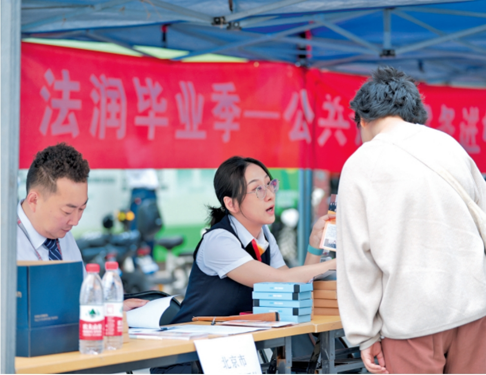 六月五日,在北京市司法局與首都師范大學聯(lián)合舉辦的“法潤畢業(yè)季”活動中,公證處工作人員在校內(nèi)設(shè)立流動公證服務(wù)點,為有需求的同學提供便捷的公證指引。據(jù)悉,只要當事人的材料齊全,符合受理條件及出證條件,跑一次就可以辦好公證書。 (北京市司法局供圖)
