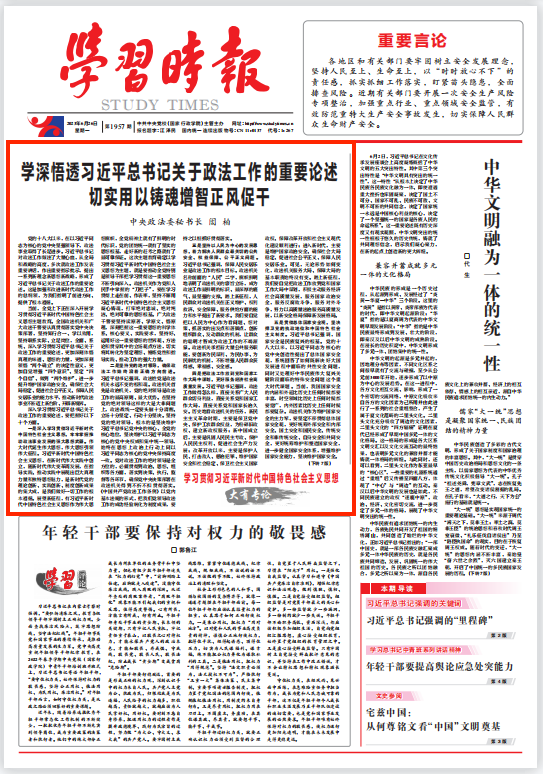 當(dāng)前,全黨上下正在深入開展學(xué)習(xí)貫徹習(xí)近平新時代中國特色社會主義思想主題教育。全國政法機(jī)關(guān)和廣大政法干警要認(rèn)真貫徹落實黨中央決策部署,堅持知行合一、學(xué)以致用,堅持聯(lián)系實際、立足崗位,全面、系統(tǒng)、深入學(xué)習(xí)貫徹習(xí)近平總書記關(guān)于政法工作的重要論述,更加深刻體悟真理的味道、思想的力量,更加深刻領(lǐng)悟“兩個確立”的決定性意義,更加自覺增強(qiáng)“四個意識”、堅定“四個自信”、做到“兩個維護(hù)”,進(jìn)一步提升維護(hù)國家政治安全、確保社會大局穩(wěn)定、促進(jìn)社會公平正義、保障人民安居樂業(yè)的能力水平,推動新時代政法事業(yè)不斷邁上新臺階、開辟新境界。
