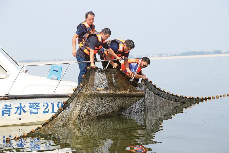 長江十年禁漁計(jì)劃從2020年1月1日0時(shí)起開始實(shí)施。江西省共青城公安局啟動(dòng)“長江流域非法捕撈首輪同步巡查執(zhí)法行動(dòng)”,嚴(yán)厲打擊非法捕撈違法犯罪行為。圖為2020年8月25日,共青城公安局民警對新發(fā)現(xiàn)的非法捕撈“迷魂陣”進(jìn)行處理。 公安部供圖