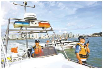 圖為海南省三亞市公安局天涯分局三亞港海岸派出所民警近日對三亞港進(jìn)出港航道進(jìn)行巡邏防控和疏導(dǎo)。 代龍超 攝