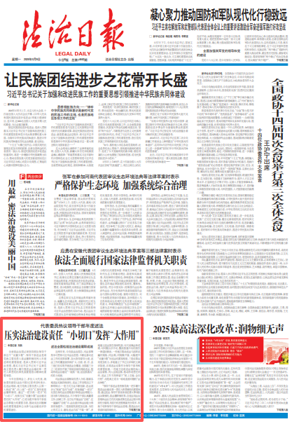 今年全國兩會上,多位人大代表、政協(xié)委員接受《法治日報》記者采訪時表示,在述法現(xiàn)場,地方黨政主要負責人以第一人稱述“我”,向上級“一把手”匯報年度依法履職情況,通過“一把手抓一把手”的“小切口”,發(fā)揮壓實“關鍵少數(shù)”法治建設責任的“大作用”,已成為提升領導干部依法辦事能力的重要手段、推動突出問題解決的重要渠道和公眾參與法治建設評價的重要途徑。