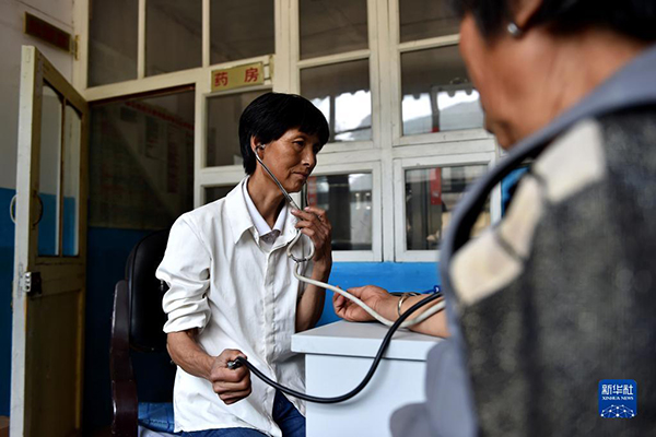 劉桂珍在山西省代縣段家灣村衛(wèi)生所,為一名村民測(cè)量血壓(資料照片)。新華社記者 詹彥 攝