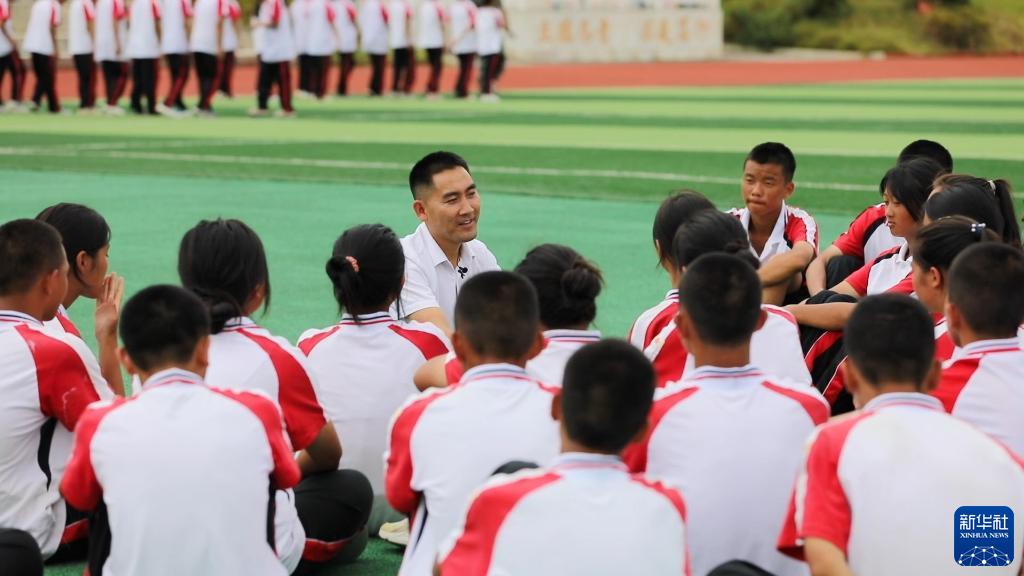 貴州省望謨縣實驗高中黨總支副書記、副校長劉秀祥在新生軍訓(xùn)間隙,和學(xué)生們聊天(2022年8月26日攝)。新華社記者 周宣妮 攝