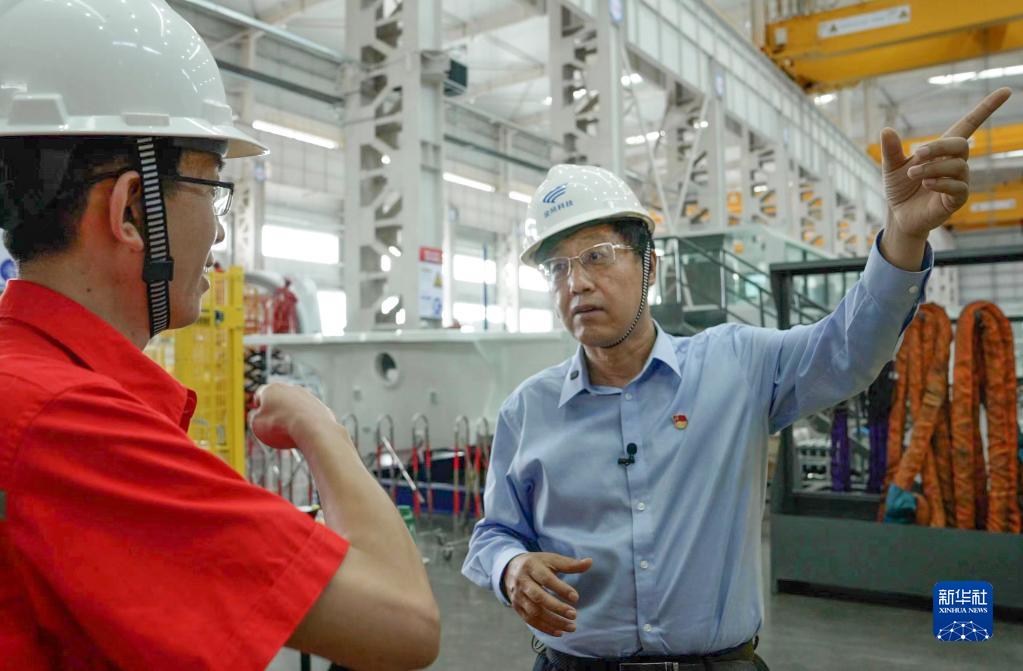 在金風(fēng)科技新疆達(dá)坂城風(fēng)電裝備產(chǎn)業(yè)基地零碳智能工廠內(nèi),武鋼(右)與技術(shù)工程師在一起交流(2022年8月6日攝)。新華社發(fā)