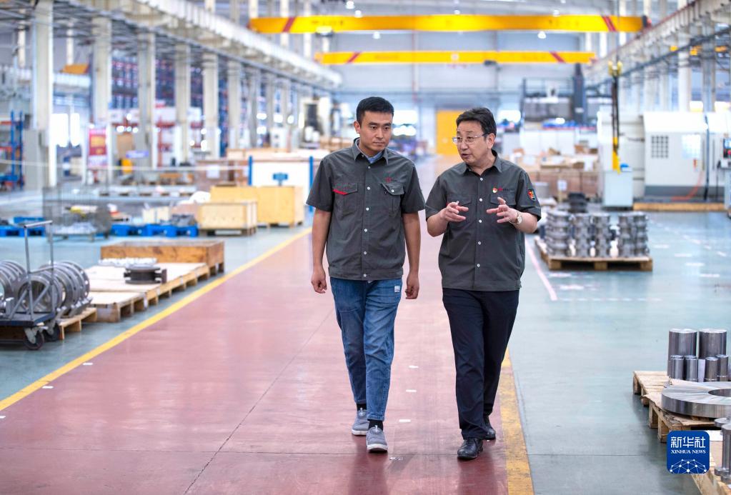馬玉山在位于寧夏吳忠市的吳忠儀表有限責(zé)任公司自動(dòng)化產(chǎn)業(yè)園數(shù)字化裝配車間中,左側(cè)為該公司生產(chǎn)的DN3000三偏心蝶閥(9月12日攝)。 新華社記者 楊植森 攝
