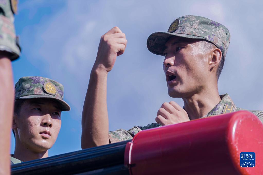 駐香港部隊(duì)某團(tuán)防空營(yíng)營(yíng)長(zhǎng)王海旭(左)在訓(xùn)練中下達(dá)作戰(zhàn)指令(2022年7月21日攝)。新華社發(fā)(田越洋 攝)