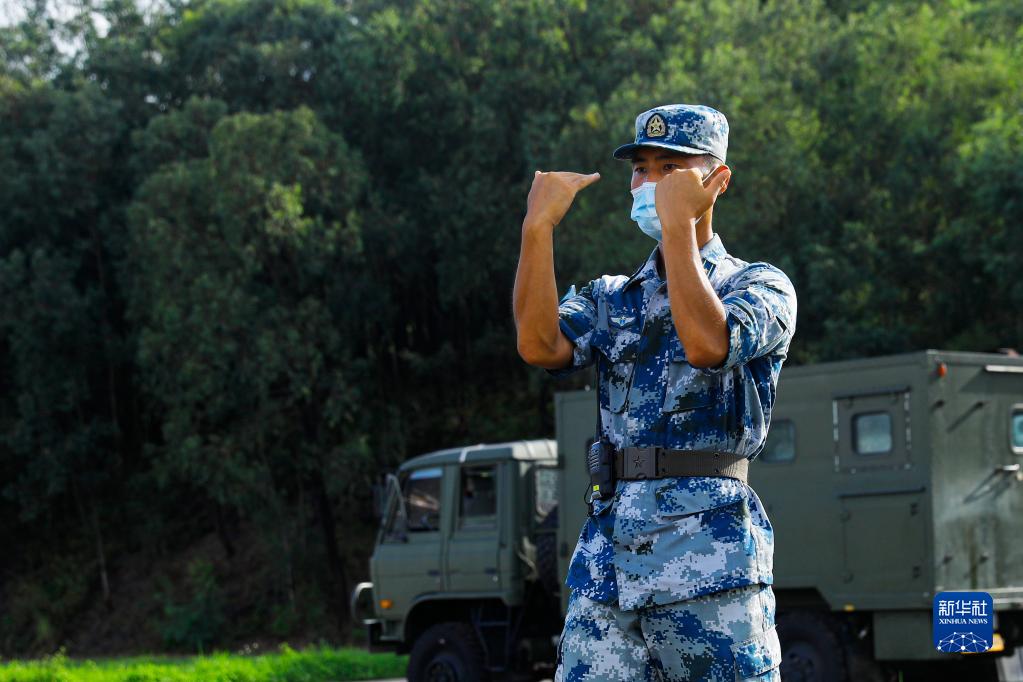 駐香港部隊(duì)某團(tuán)防空營(yíng)營(yíng)長(zhǎng)王海旭在防空陣地上指揮戰(zhàn)斗裝備進(jìn)入預(yù)定區(qū)域(2020年8月13日攝)。新華社發(fā)(田越洋 攝)