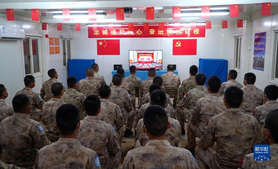 10月16日,中國(guó)第十二批赴南蘇丹(瓦烏)維和工兵分隊(duì)官兵收看中國(guó)共產(chǎn)黨第二十次全國(guó)代表大會(huì)開(kāi)幕會(huì)。新華社(張益瑋 攝)