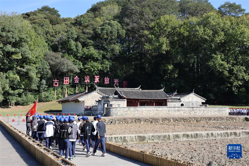 10月19日,在福建省上杭縣古田鎮(zhèn),中學(xué)生研學(xué)團(tuán)隊(duì)在古田會(huì)議會(huì)址參觀學(xué)習(xí)。新華社發(fā)(范道鑫 攝)