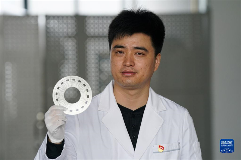 10月17日,在中國(guó)科學(xué)院合肥物質(zhì)科學(xué)研究院強(qiáng)磁場(chǎng)科學(xué)中心,副研究員房震展示水冷磁體線圈的核心組件——比特片。新華社記者 杜宇 攝