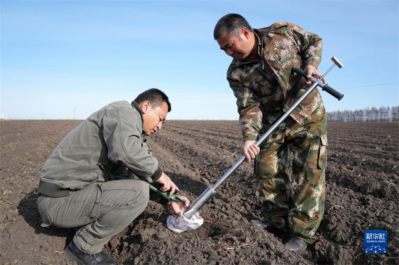 10月20日,北大荒農(nóng)墾集團(tuán)有限公司北安分公司趙光農(nóng)場(chǎng)有限公司技術(shù)人員在取土樣。新華社記者 王建威 攝