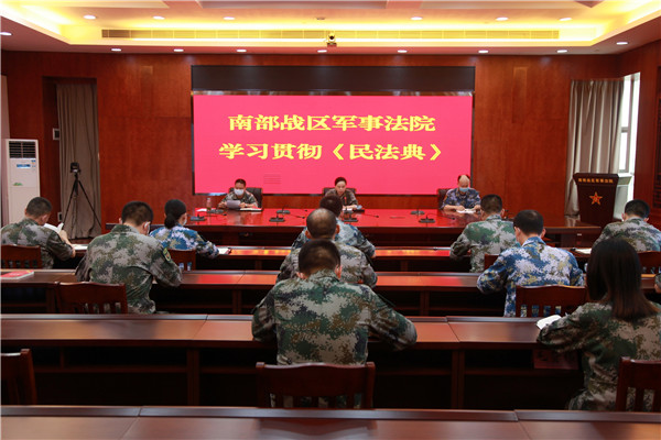 南部戰(zhàn)區(qū)軍事法院召開專題黨委會,認(rèn)真學(xué)習(xí)習(xí)近平主席在中央政治局第二十次集體學(xué)習(xí)時的重要講話、全國法院學(xué)習(xí)貫徹2020年全國兩會精神視頻會議精神和民法典,專題部署推動戰(zhàn)區(qū)兩級軍事法院和轄區(qū)部隊民法典學(xué)習(xí)宣傳貫徹工作,要求戰(zhàn)區(qū)兩級軍事法院在學(xué)習(xí)宣傳貫徹民法典中走在前列,為部隊和官兵樹好標(biāo)桿;準(zhǔn)確理解和把握民法典立法精神、條文含義和最新內(nèi)容,提高運用民法典維護(hù)官兵權(quán)益、化解矛盾糾紛、促進(jìn)部隊和社會和諧穩(wěn)定的能力;把深入宣傳貫徹民法典作為當(dāng)前和今后一個時期的工作重點,在戰(zhàn)區(qū)部隊營造尊法學(xué)法守法用法的濃厚氛圍。