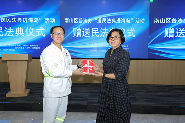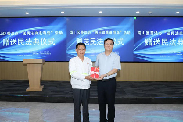 9月1日下午,廣東省深圳市司法局黨委副書記、副局長蔣小文,普法和依法治理處處長劉偉東,蛇口街道黨工委書記藍(lán)濤,南山區(qū)司法局局長康甲光一起,將一批民法典送到了位于前海蛇口水域的孖洲島。