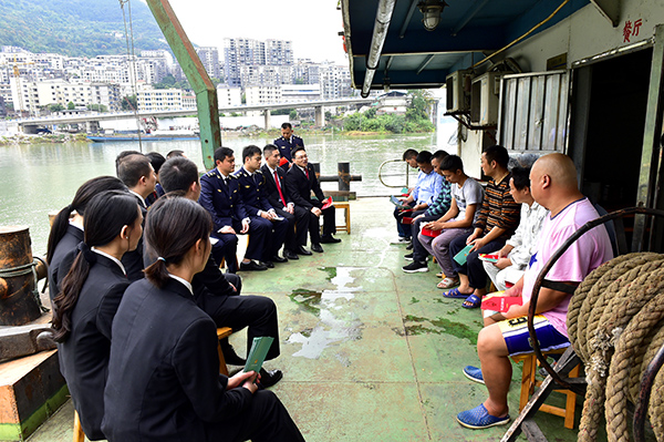 圖為青年干警向船員宣講民法典