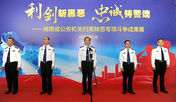 5月27日上午,湖南省公安廳隆重舉辦“利劍斬黑惡、忠誠(chéng)鑄警魂”掃黑除惡專(zhuān)項(xiàng)斗爭(zhēng)成果展。成果展分高位謀劃、組織推動(dòng)、大案攻堅(jiān)、專(zhuān)項(xiàng)打擊、隊(duì)伍建設(shè)、工作成效六個(gè)方面,展示了全省公安機(jī)關(guān)掃黑除惡專(zhuān)項(xiàng)斗爭(zhēng)的輝煌戰(zhàn)果,再現(xiàn)了全省廣大公安民警堅(jiān)決圍剿黑惡勢(shì)力、徹底鏟除其滋生土壤的戰(zhàn)斗歷程。副省長(zhǎng)、公安廳長(zhǎng)許顯輝出席開(kāi)幕式并致辭。