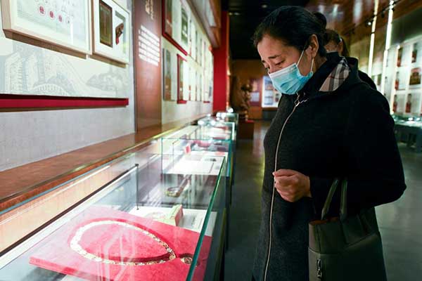 2021年4月3日,在烏魯木齊市革命烈士陵園,瑪依努爾看著愛(ài)人艾熱提的獎(jiǎng)?wù)孪萑肷钏肌P氯A社記者 王菲 攝
