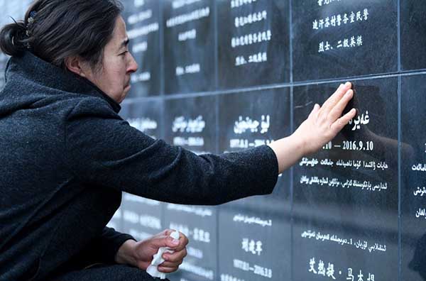 2021年4月3日,在烏魯木齊市革命烈士陵園,瑪依努爾撫摸鐫刻在新疆公安英烈紀(jì)念碑上愛(ài)人艾熱提的名字。新華社記者 王菲 攝