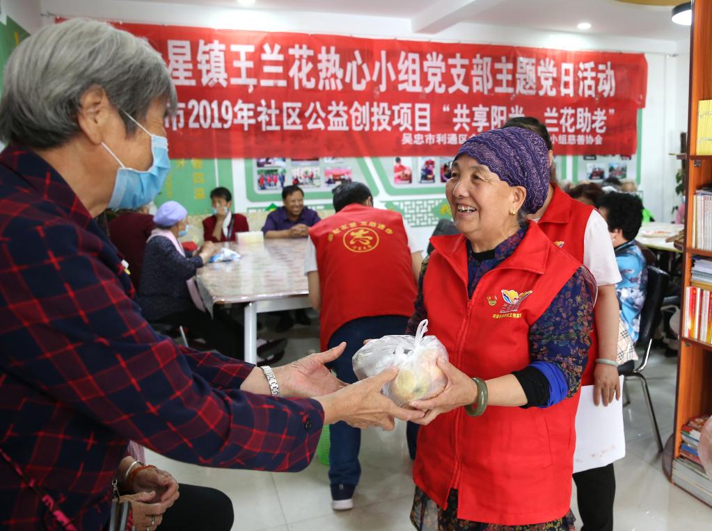 王蘭花(右)向來到蘭花志愿服務(wù)站參加活動的老人發(fā)放“愛心水果”。(2020年6月23日攝)新華社記者賈浩成攝