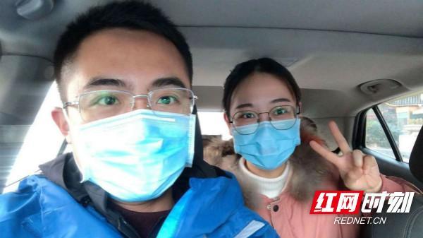 鄭能量(左)接送醫(yī)護(hù)人員上下班時(shí)的合影。
