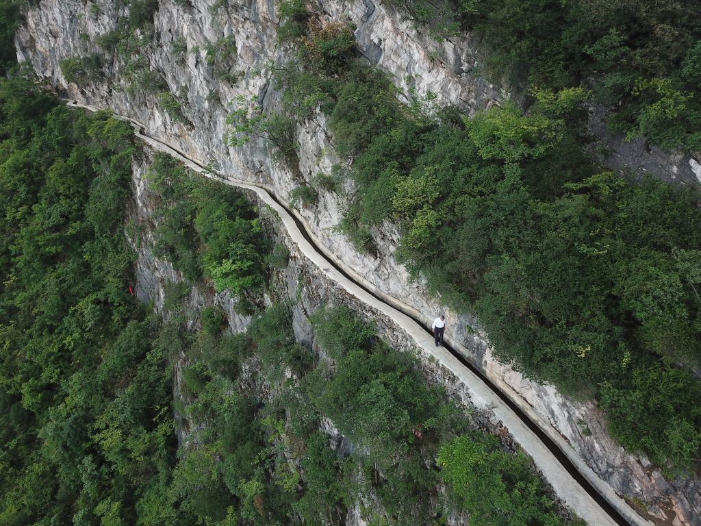 黃大發(fā)沿著修建在絕壁上的“大發(fā)渠”巡查(2018年8月11日無(wú)人機(jī)拍攝)。新華社記者劉續(xù)攝