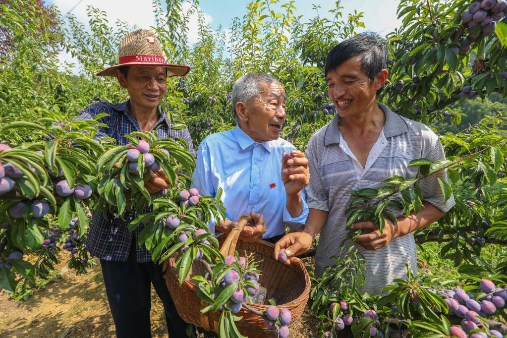 黃大發(fā)(中)和果農(nóng)們研究水果種植技術(shù)(2018年8月12日攝)。新華社記者劉續(xù)攝