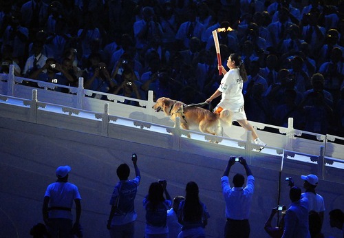 2008年9月6日,中國第一位殘奧會冠軍平亞麗在北京殘奧會開幕式上手持火炬?zhèn)鬟f。新華社記者王頌攝