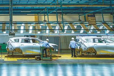 在海南省海馬汽車??诨氐暮秆b車間內(nèi),工人進(jìn)行流水線作業(yè)。