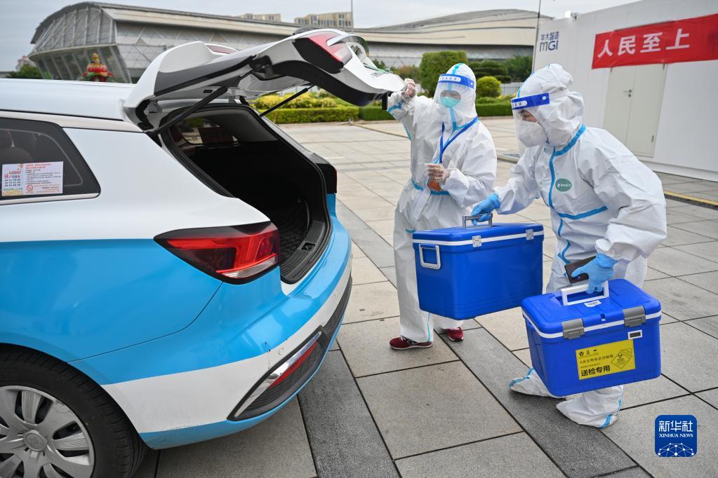 3月24日,在福建泉州市海峽體育中心聯(lián)合方艙核酸檢測基地,參加“抗疫志愿車隊”的出租車司機(左)協(xié)助醫(yī)務(wù)人員裝運核酸檢測樣本。新華社發(fā)(周義攝)
