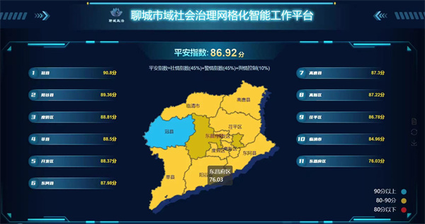 試點(diǎn)工作中,聊城市運(yùn)用市域社會治理智能化平臺助力深化平安建設(shè),在平臺定期生成全市“平安指數(shù)”,涵蓋各縣區(qū)社會治安、道路交通、安全生產(chǎn)等10項(xiàng)指標(biāo),引導(dǎo)精準(zhǔn)查找、整改短板問題。針對重大活動,發(fā)揮平臺研判決策、指揮調(diào)度功能,對問題及時(shí)發(fā)現(xiàn)處置,助力工作嚴(yán)格落實(shí)。