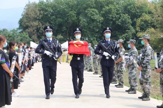 3月30日,蔡曉東烈士被安葬在云南省西雙版納景洪市勐龍烈士陵園,長眠在他用生命守護(hù)的邊境線旁。圖為安葬儀式現(xiàn)場。 云南出入境邊防檢查總站供圖