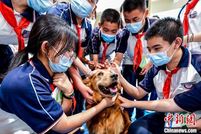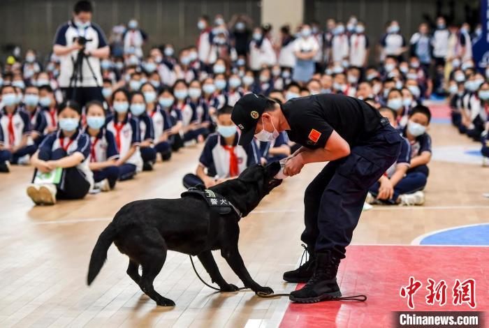 學(xué)生們與展示完搜索毒品技能的緝毒犬親密互動(dòng)。 劉新 攝