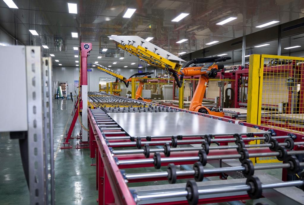 在寧夏金晶科技有限公司生產(chǎn)車間內(nèi),機(jī)械臂將成品光伏玻璃進(jìn)行堆垛(6月1日攝)。新華社記者 楊植森 攝