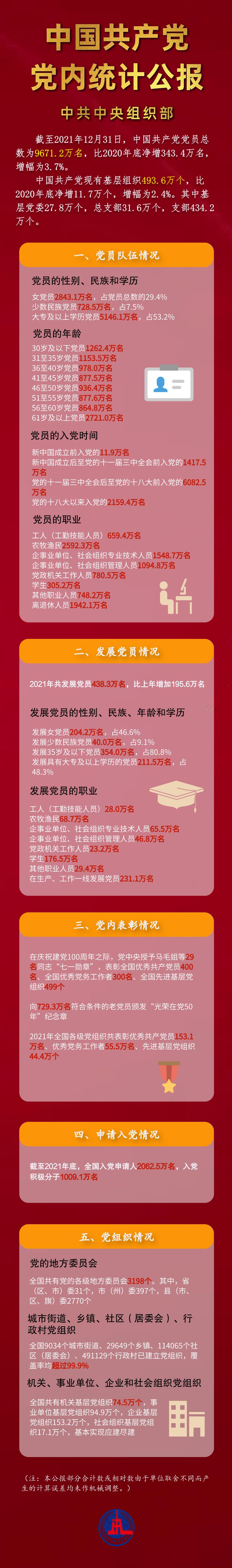 中央組織部最新黨內(nèi)統(tǒng)計數(shù)據(jù)顯示,截至2021年底,中國共產(chǎn)黨黨員總數(shù)為9671.2萬名,比上年凈增343.4萬名。黨的基層組織493.6萬個,比上年凈增11.7萬個。中國共產(chǎn)黨一路走來,始終把基層黨組織和黨員隊伍建設(shè)作為黨的建設(shè)的基礎(chǔ)性工作,不斷吸收新鮮血液,著力鍛造先鋒隊伍,使黨始終保持旺盛生命力和強(qiáng)大戰(zhàn)斗力。