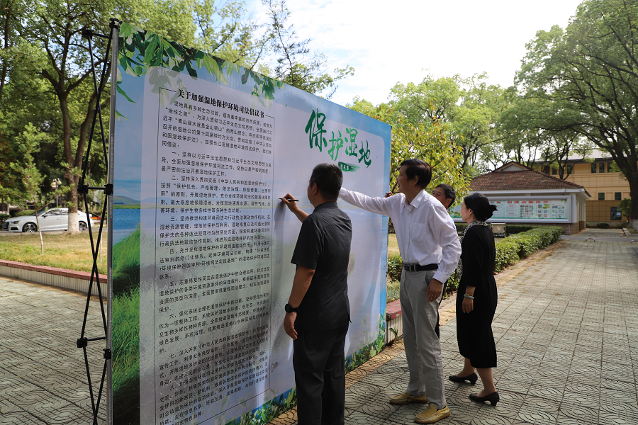 本次調(diào)研活動(dòng)由武漢海事法院黨組成員、副院長(zhǎng)裴縝主持。襄陽(yáng)市中級(jí)人民法院、宜昌市中級(jí)人民法院、荊州市中級(jí)人民法院、湖北省檢察院武漢鐵路運(yùn)輸分院、黃石市人民檢察院、荊門市人民檢察院、全國(guó)律協(xié)環(huán)境資源委員會(huì)等單位或組織的代表先后就如何推進(jìn)濕地保護(hù)工作進(jìn)行交流發(fā)言。裴縝強(qiáng)調(diào),湖北江河渠網(wǎng)密布、湖泊庫(kù)塘眾多,素有“千湖之省”的美譽(yù),濕地資源較為豐富,濕地保護(hù)意義重大。近年來(lái),由于濕地保護(hù)情況復(fù)雜、問(wèn)題多樣,濕地資源的可持續(xù)發(fā)展應(yīng)當(dāng)成為各方需要重點(diǎn)關(guān)注的問(wèn)題。隨著《濕地公約》第十四屆締約方大會(huì)將在湖北武漢舉行,各方要堅(jiān)持“共抓大保護(hù)、不搞大開發(fā)”的理念,積極探索濕地保護(hù)的中國(guó)發(fā)展路徑,在貫徹落實(shí)“長(zhǎng)江大保護(hù)”戰(zhàn)略中發(fā)揮應(yīng)有的作用,并通過(guò)不斷強(qiáng)化各方之間的溝通和協(xié)作,共同推進(jìn)濕地保護(hù)工作取得新的成績(jī)。會(huì)后,參會(huì)代表集中簽署《關(guān)于加強(qiáng)濕地保護(hù)環(huán)境司法倡議書》,共同倡議:堅(jiān)持以習(xí)近平法治思想和習(xí)近平生態(tài)文明思想為指導(dǎo),深入貫徹實(shí)施并積極宣傳《中華人民共和國(guó)濕地保護(hù)法》,堅(jiān)持推進(jìn)構(gòu)建環(huán)境司法與行政聯(lián)動(dòng)協(xié)作機(jī)制,充分發(fā)揮濕地保護(hù)的環(huán)境司法能動(dòng)作用,注重修復(fù)性司法在濕地保護(hù)中的合理運(yùn)用,強(qiáng)化系統(tǒng)治理在濕地保護(hù)中的功能,進(jìn)一步加強(qiáng)濕地環(huán)境司法保護(hù)與環(huán)境資源法學(xué)研究、調(diào)研、交流、協(xié)作,共同打造濕地保護(hù)環(huán)境司法特色品牌。隨后,參會(huì)代表赴漳河濕地進(jìn)行實(shí)地調(diào)研。