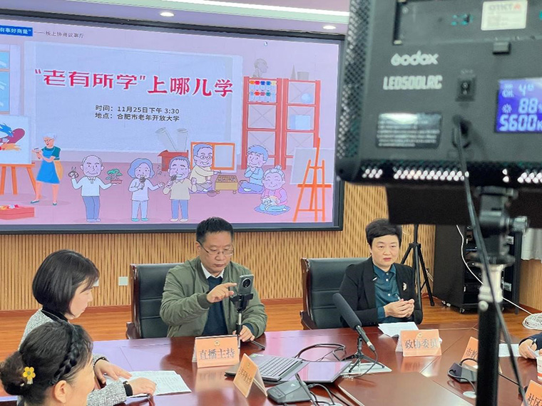三臺(tái)攝像機(jī)、一個(gè)電子大屏、兩個(gè)補(bǔ)光燈……這是直播現(xiàn)場(chǎng),也是線上協(xié)商議事廳。合肥老年開(kāi)放大學(xué)內(nèi)的會(huì)議室正在進(jìn)行一場(chǎng)關(guān)于“‘老有所學(xué)’上哪兒學(xué)”的線上協(xié)商議事直播活動(dòng)。